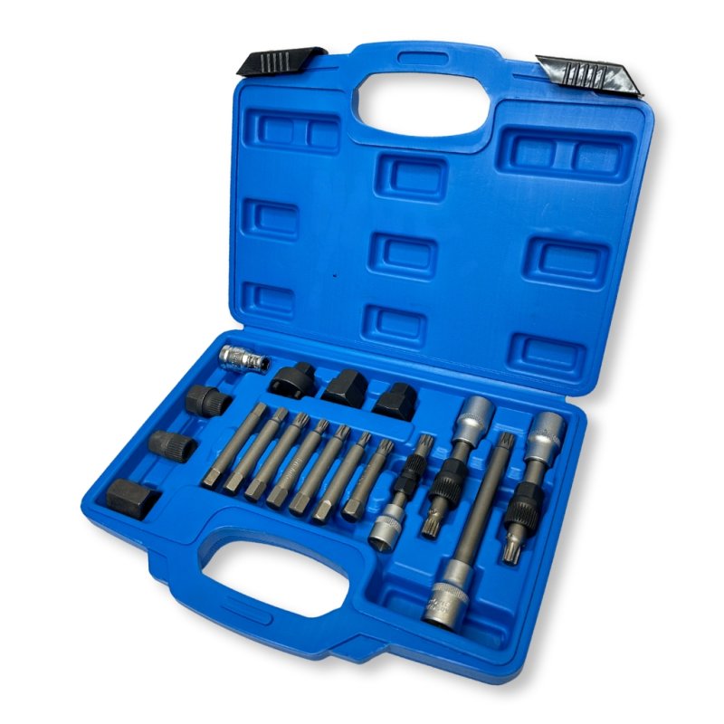 Набор для ремонта генераторов подойдет для использования с автомобилями W, Audi, Mercedes Benz, Renault, BMW, Ford, Ft и т.д. Комплект необходим для снятия приводного шкива на генераторах Bosch, Marelli, Valeo. Комплектация: Два комбинированных ключа с профилем T50 x 113 mm и M10 x 113 mm. Комбинированный ключ с приводным квадратом 3/8” с профилем M10 x 80mm для Fiat. Торцевая бита с профилем M10 x 140 mm. Три зубчатых ключа: 15mm HEX x 33 зуба; 22mm HEX x 33 зуба, 15mm Hex x33 зуба. Два шестигранных ключа 22mm HEX и 17mm HEX. Три шестигранных ключа: 22x28 mm / 19x28 mm / 21x28 mm. Зубчатый ключ Ø 35mm / 4-е зуба. Зубчатый ключ Ø 38mm / 3-и зуба. Адаптер ½ дюйма / HEX 10 mm. Профильная бита M10xH12 64 мм. Шесть бит HEX 10 мм x 75mm CR-V: T40, T50, M8, M10, H8, H10. Кейс
