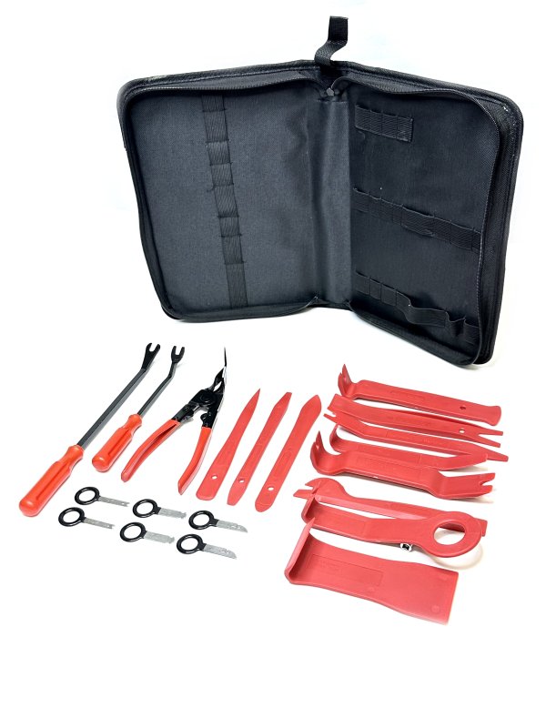 Набор применяется для проведения арматурных работ с элементами обшивки салона. Набор включает в себя: - пластиковые лопатки различной конфигурации для снятия пластиковых элементов обшивки. - ключи для демонтажа мультимедиа устройств. - инструмент для демонтажа клипс (клипсодеры) - клещи для демонтажа клипс.