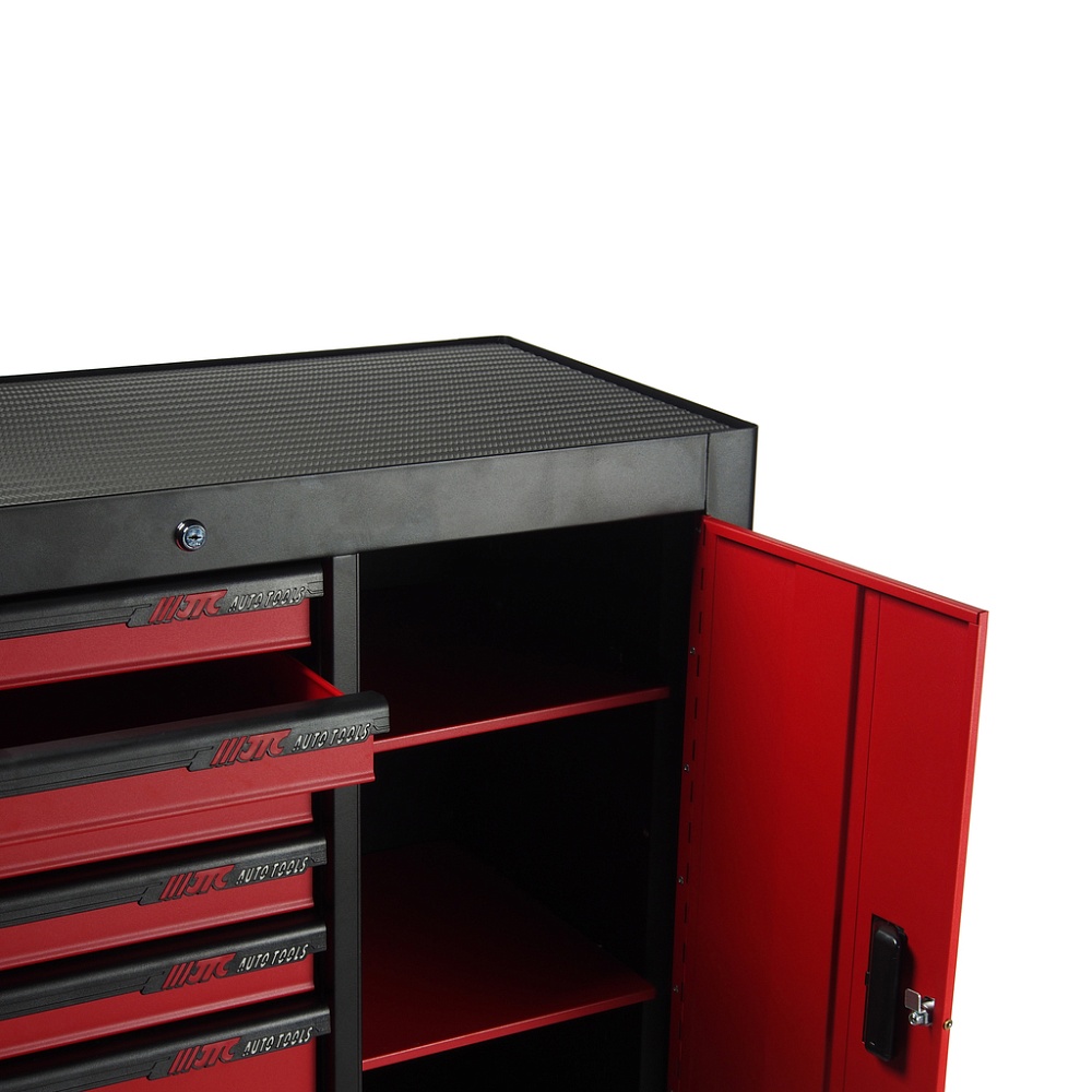 Перфорированные внутренние стенки боковых ящиков с квадратными отверстиями предоставляют возможность разместить дополнительные аксессуары для хранения инструментов. Применяется с серией подвесных приспособлений JTC-3218.