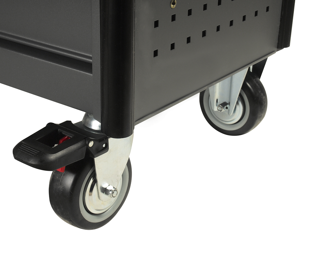 Инструментальная тележка с набором инструментов JTC 5021+344 позволяет удобно расположить оборудование и оснастку, что максимально оптимизирует рабочий процесс. Специальные борты защищают оборудование от повреждений, а также гарантируют безопасность автомеханика. Роликовые направляющие служат для плавного открывания или закрывания секций. Нескользящие вкладки в ящиках и коврик из АБС способствуют комфортному хранению мелких деталей. Закрытый тип ящиков исключает выпадение инструмента во время перемещения.