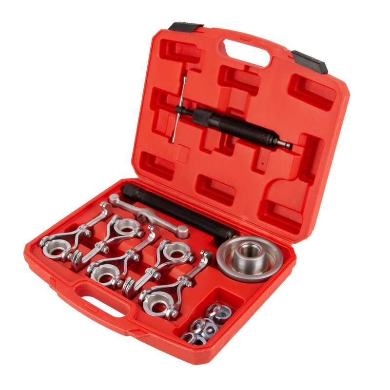 Набор для снятия хабов (муфт) и барабанов диаметром до 250 мм. Поставляется с гидравлическим цилиндром 10т. Этим инструментом можно снять ступичную гайку диаметром от 3 до 250 мм. Каждый инструмент изготовлен из высокопрочной стали, обеспечивающей надежность и долговечность набора.