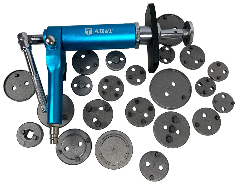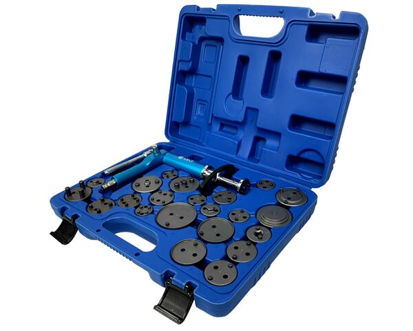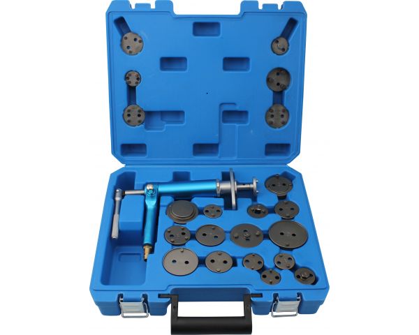 Набор для возврата тормозных поршней, исключающий риск повреждения поршней или резиновых манжет. Набор содержит основной инструмент с пневмоцилиндром для выталкивания шеек поршней. В комплект входят 20 адаптеров. Пригоден для суппортов как с левой, так и с правой резьбой.