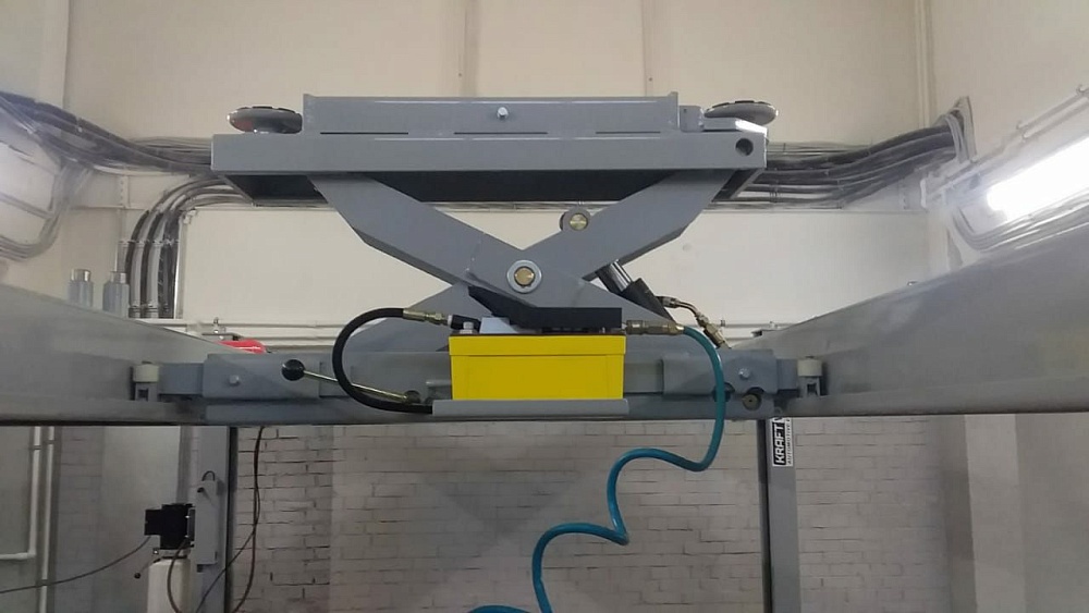 Kraftwell KRWJ7P - траверса ножничная гидравлическая с пневматическим приводом г/п 3200 кг. Устанавливается на четырехстоечный подъемник.