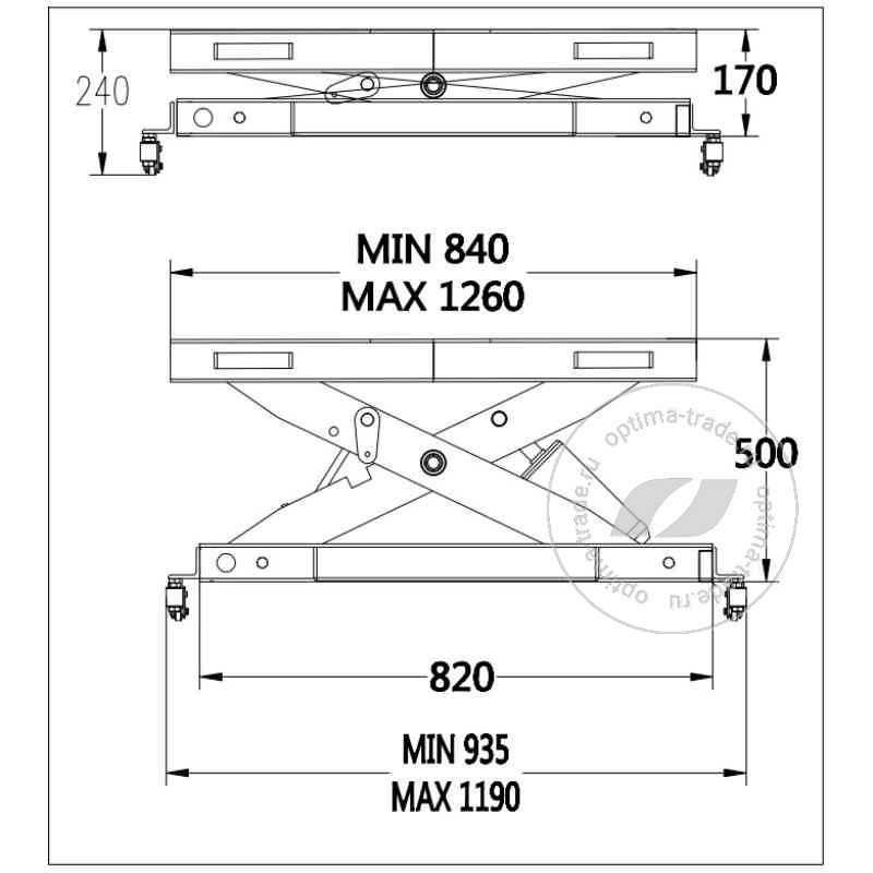 Траверса оснащена регулируемыми колесами, расположенными на основании, для возможности эксплуатации на подъемниках и смотровых ямах различной ширины.