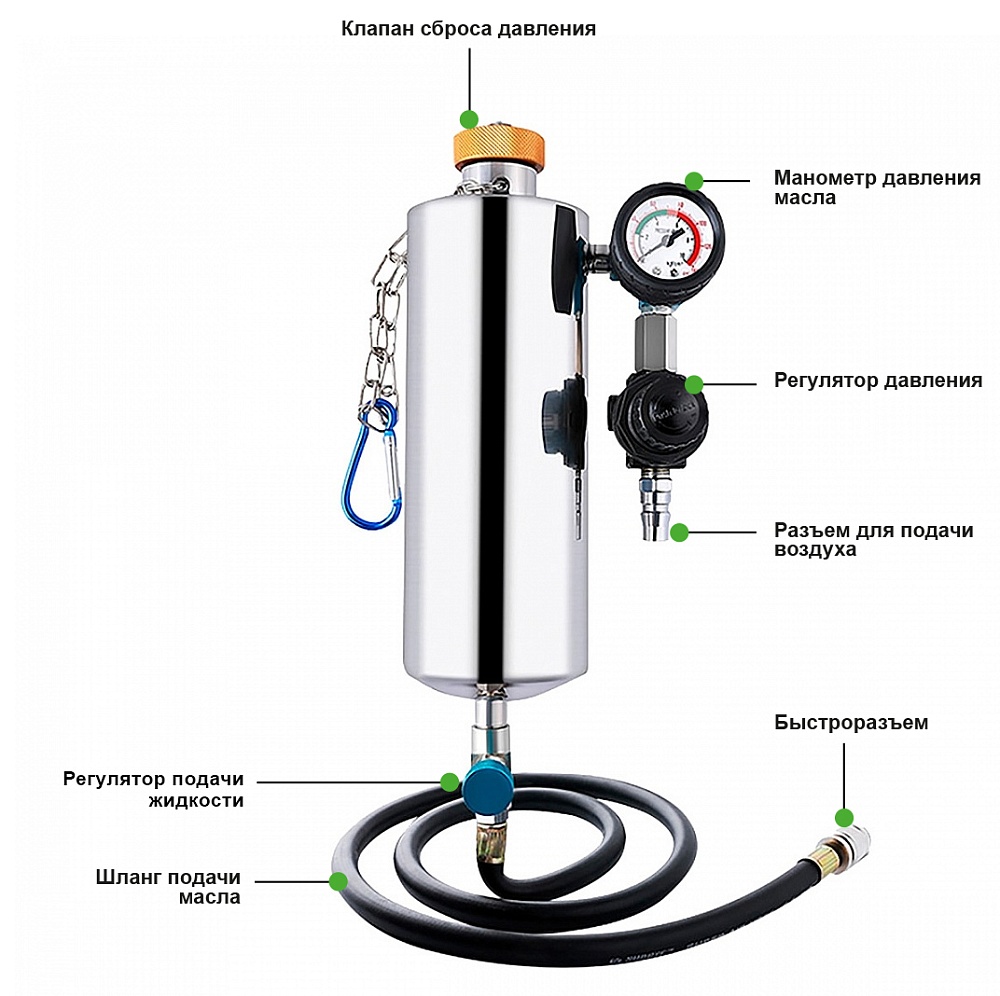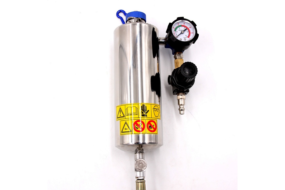 Залить промывочную жидкость в баллон, после чего надежно завернуть горловину и подвесить баллон под капотом автомобиля. Присоединить шланг, идущий от компрессора на входной разъем баллона и осуществить подачу воздуха в систему. Необходимое давление следует выставить ориентируясь на показания манометра с помощью редуктора. После чего открыть кран на подающем шланге и убедиться в герметичности всех соединений.