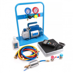 В зависимости от модели, установка комплектуется одноступенчатой или двухступенчатой вакуумной помпой с производительностью 60 л/мин. В комплект также входят 4 заправочных шланга различной длины ( 3м - 2шт., 1,5м - 1шт., 0.5м - 1 шт.). Для удобства транспортировки и хранения все компоненты установки установлены на металлической раме.