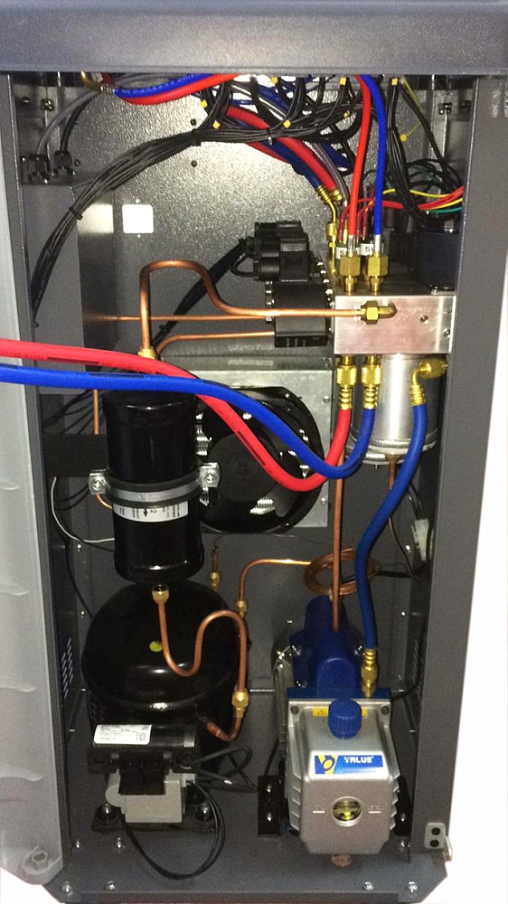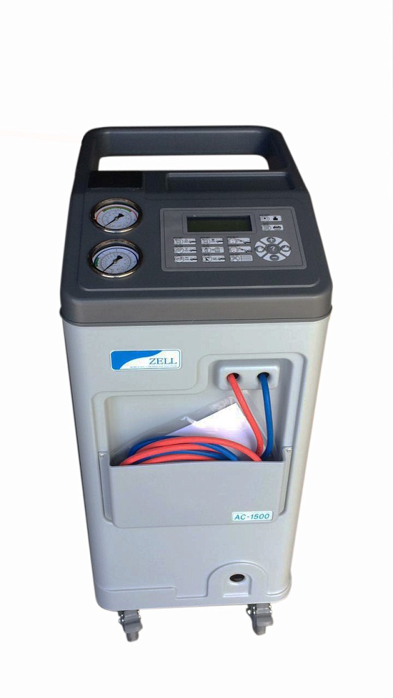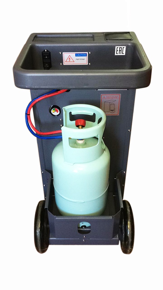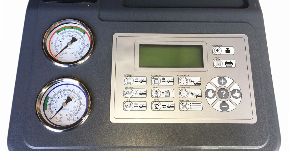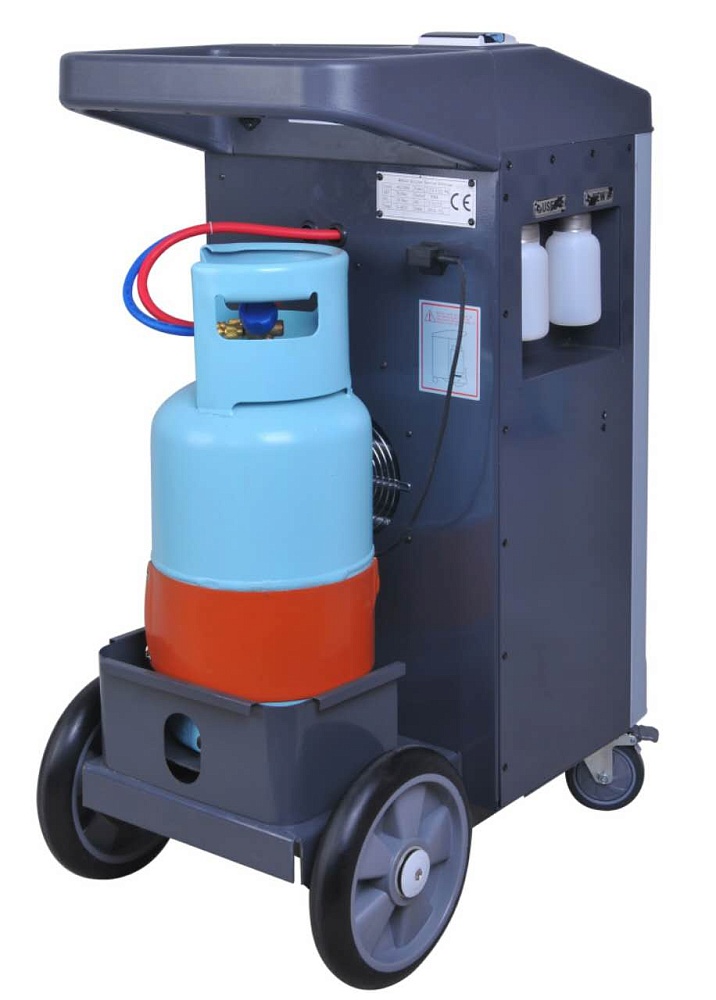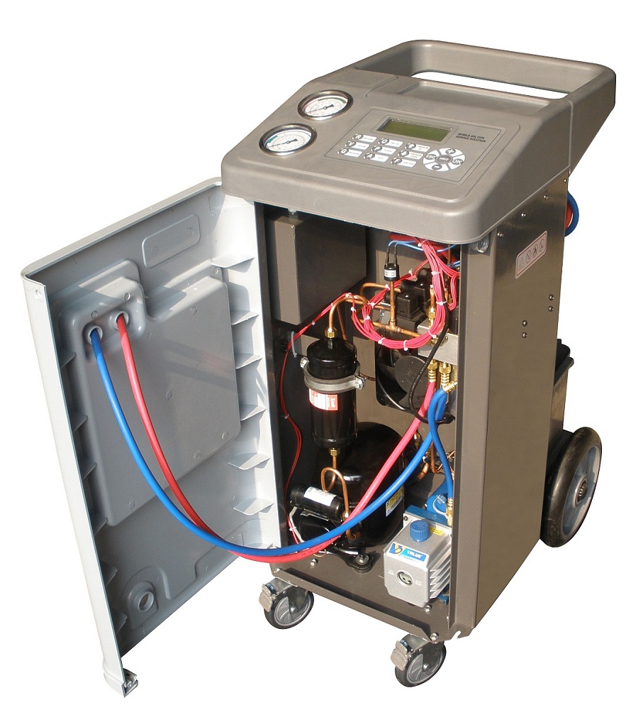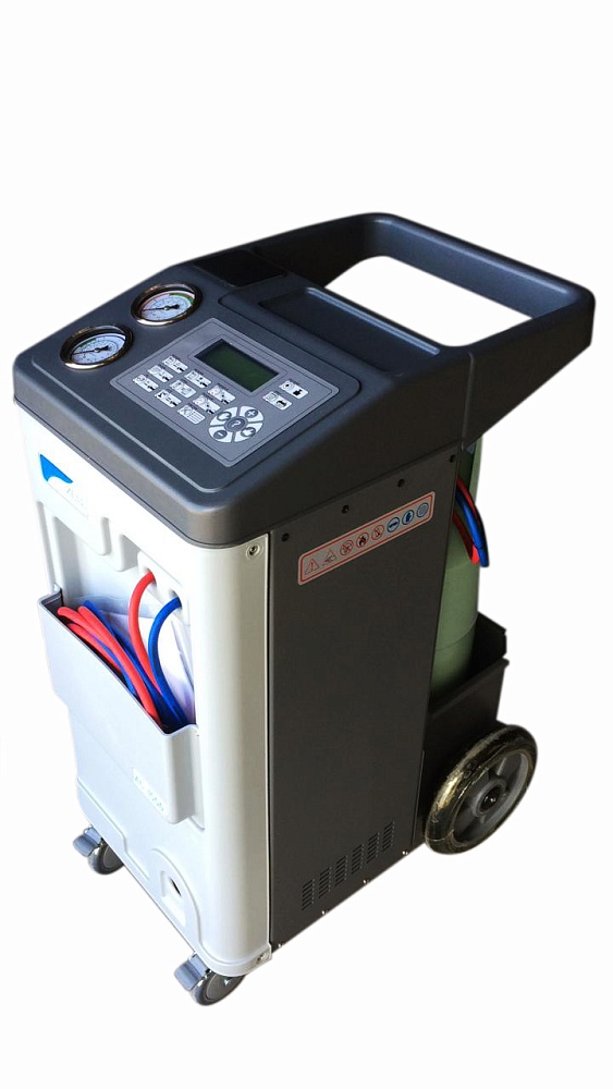 Автоматическая установка для обслуживания автомобильных систем кондиционирования с фреоном R-134a. Функции: откачивание и очистка хладагента из системы, отделение и последующий сброс масла, вакуумирование системы, автоматическая заправка фреона и масла.