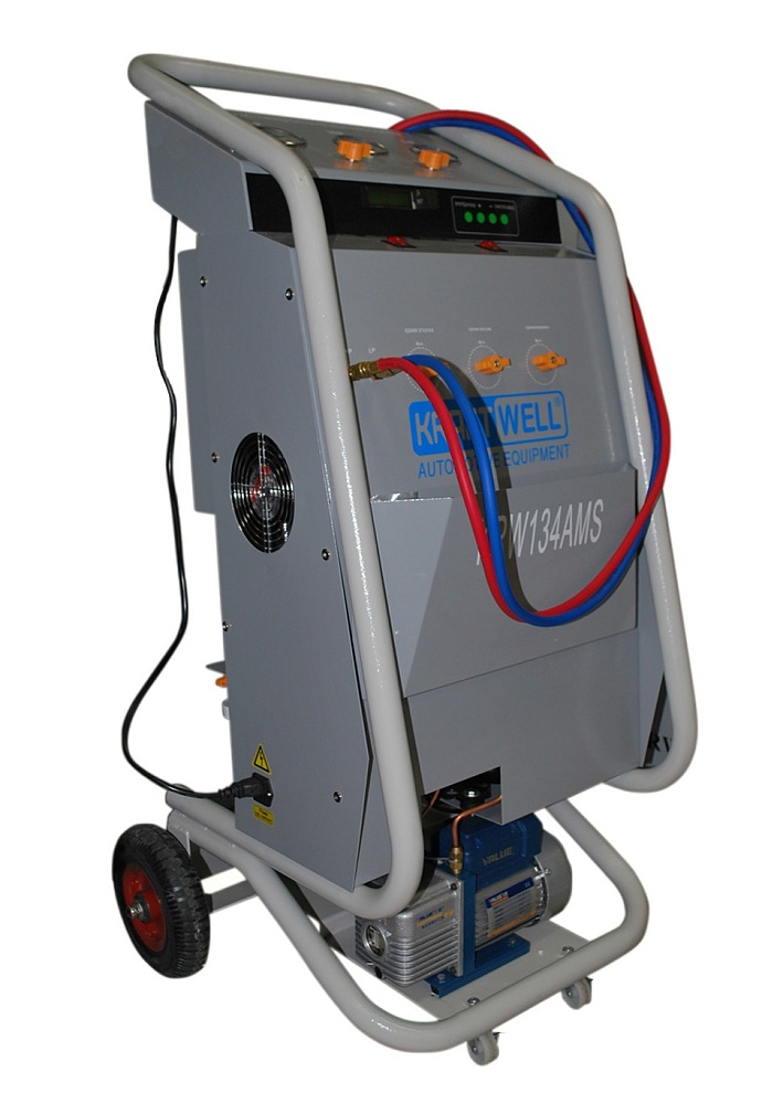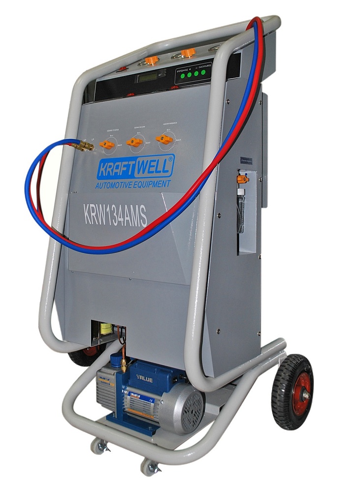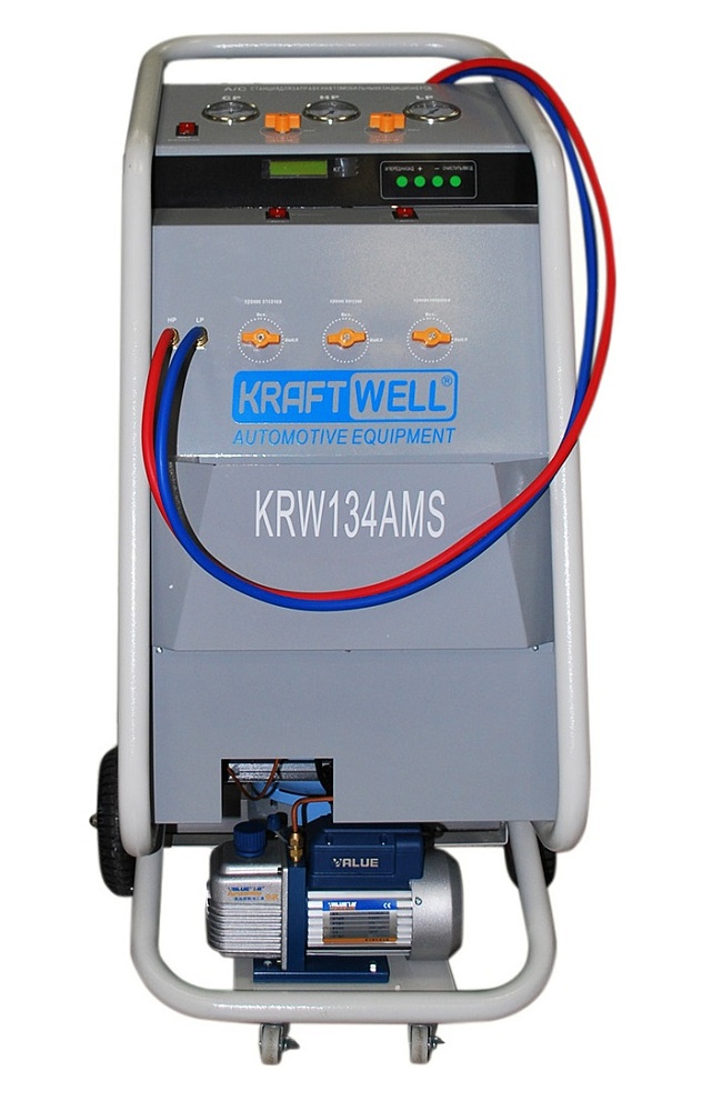 Установка для заправки автомобильных кондиционеров KRAFTWELL KRW134AMS с ручным управлением представляет из себя усовершенствованную версию классической установки благодаря управлению некоторыми функциями при помощи электромагнитных клапанов, а также возможности установки необходимого количества заправляемого фреона на ЖК дисплее. Запуск процедуры откачки фреона из системы и вакуумирования производится выключателями на лицевой панели. Вакуумный насос VALUE имеет производительность 60 л/мин и без труда справится со своими обязанностями. Откачка фреона производится в отдельный баллон емкостью 10 литров, расположенный в задней части установки. Корпус установки сделан из металла и установлен на металлический каркас, снабженный надувными колесами для удобства перемещения.