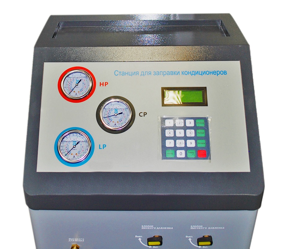 Автоматическая установка для обслуживания автомобильных систем кондиционирования с фреоном R-134a. Функции: откачивание и очистка хладагента из системы, отделение и последующий сброс масла, вакуумирование системы, автоматическая заправка фреона и масла.