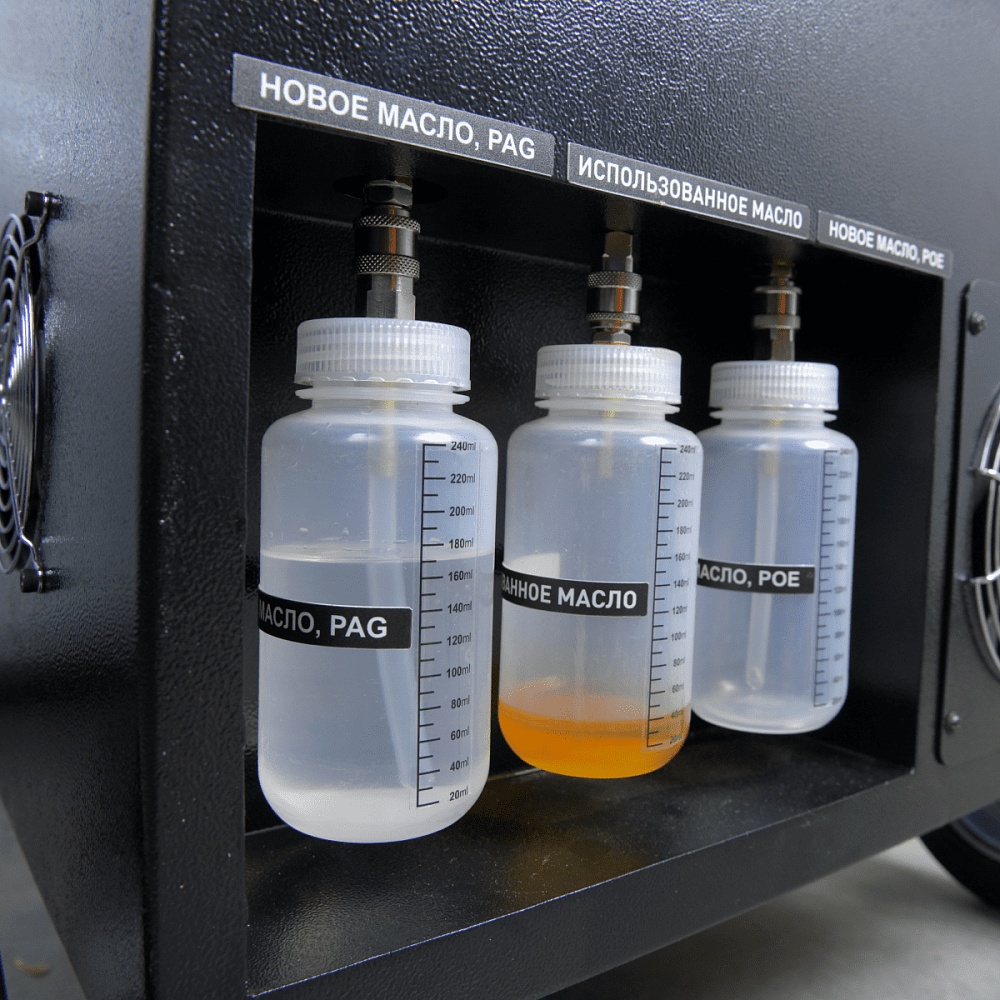 • Для предотвращения смешивания разных типов масел и выхода из строя установки или ее компрессора при обслуживании таких кондиционеров, конструкцией установки предусмотрено переключение с масла PAG на POE. Установка оснащена сразу двумя емкостями для масел
